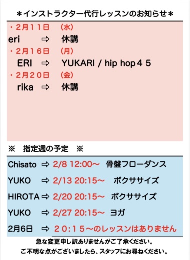 インストラクター代行・休講のお知らせ(2月)
